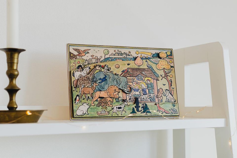 A betlehem három rétegű fából készül, ami térhatást kölcsönöz neki. A hátsó talp segítségével könnyen asztalra helyezhető vagy falra akasztható – finom, mégis kifejező karácsonyi dísz.