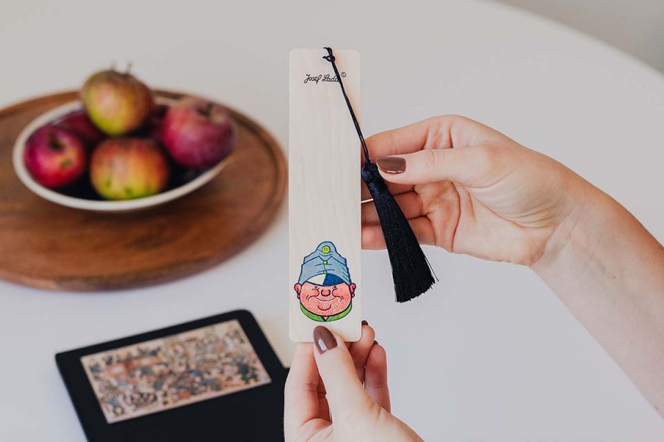 A Svejk, a derék katona mintájával díszített fa könyvjelző minden oldalra humort és derűt visz. Josef Lada legendás figurája arra emlékeztet, hogy még a legnagyobb zűrzavarban is van hely a mosolynak. Praktikus, játékos és tele van cseh lélekkel.