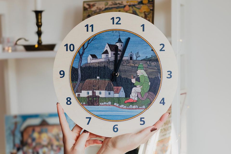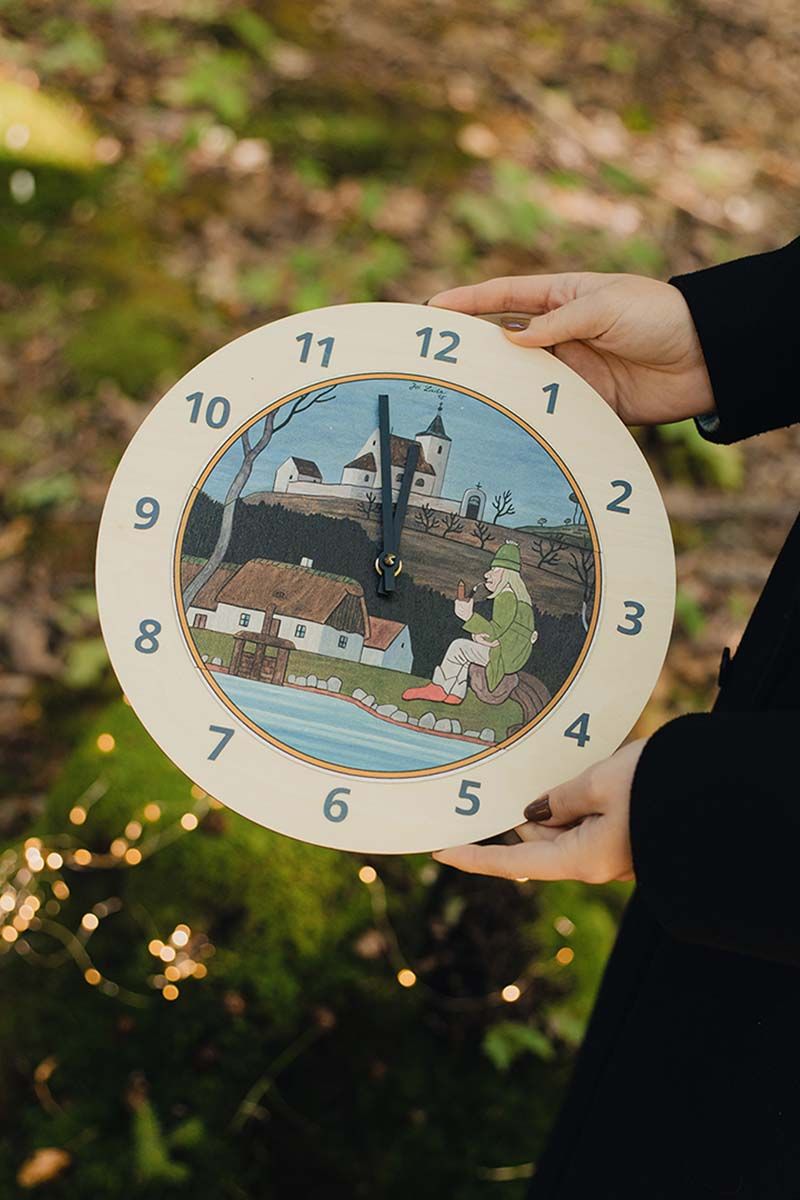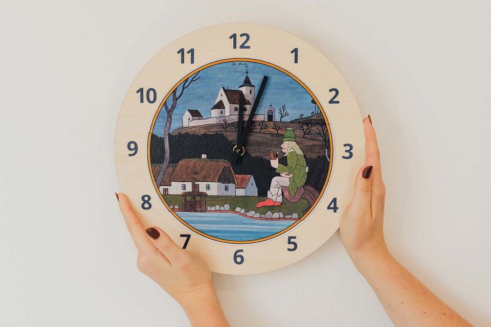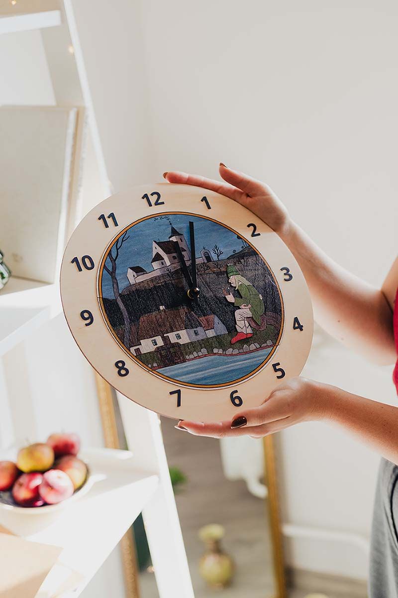 A Vízimanó motívumú fa falióra Josef Lada egyik legkedvesebb mesefiguráját idézi meg. Ez a vízimanó nem félelmetes – inkább nyugodt, bölcs és kissé álmodozó, amint pipázva üldögél a tó partján. Az óra minden pillantása békét és nosztalgiát hoz otthonába, akár egy csendes, havas karácsonyi este.